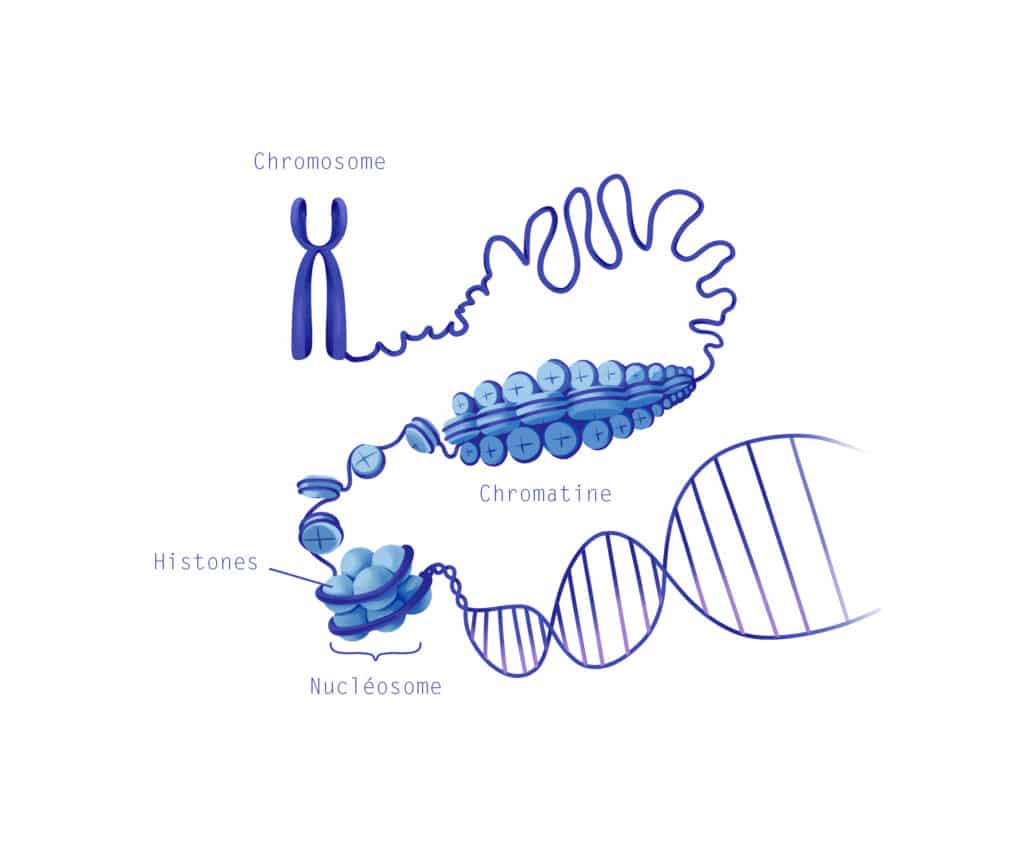 L’ADN est une molécule extrêmement longue. Chaque cellule humaine contient environ 2 mètres d’ADN! Afin que toute l’information génétique puisse entrer dans le petit noyau d’une cellule, l’ADN est compacté, enroulé sur lui-même, formant ce qu’on appelle la chromatine.