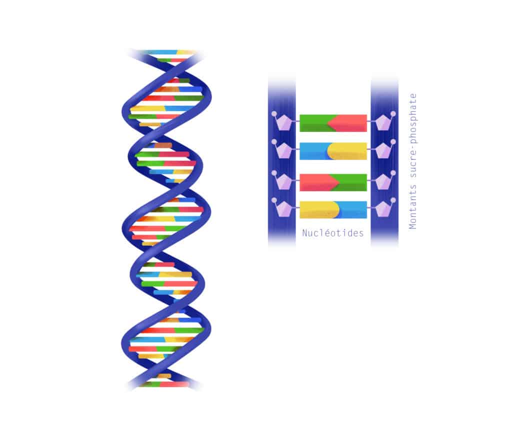L’ADN est une très longue molécule composée de deux brins qui forment ensemble une sorte d’échelle torsadée sur elle-même qu’on appelle la double hélice.